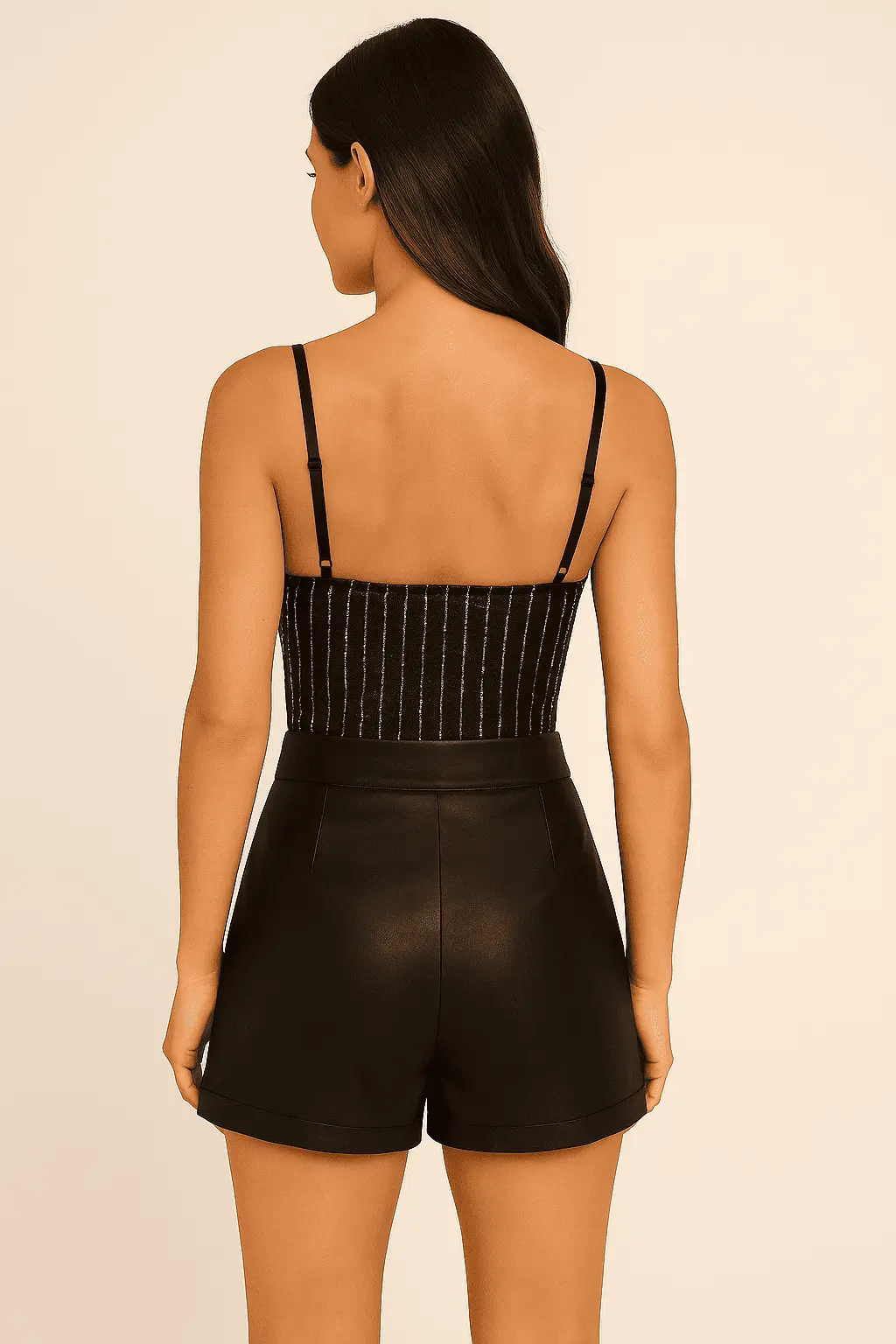 Tela transparente con detalles de brillo verticales, que aportan un toque sofisticado y glamoroso.